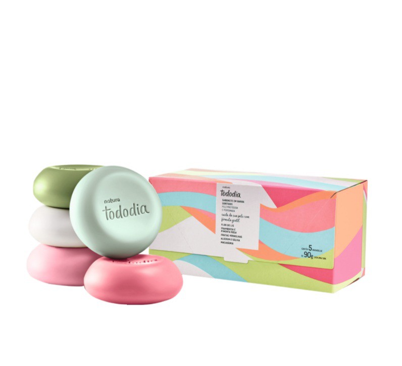 Sabonete em barra puro vegetal sortido caixa com 5 unidades sendo: (1 flor de lis, 1 alecrim e sálvia, 1 framboesa e pimenta rosa, 1 macadâmia e 1 frutas vermelhas) de 90 g cada. Fórmula 100% vegetal que limpa delicadamente a pele com explosão de fragrâncias. Ótima opção de presente!